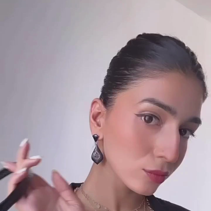 The earrings sway gently, catching the light, their intricate patterns dancing in the air, casting intricate shadows that whisper tales of elegance.